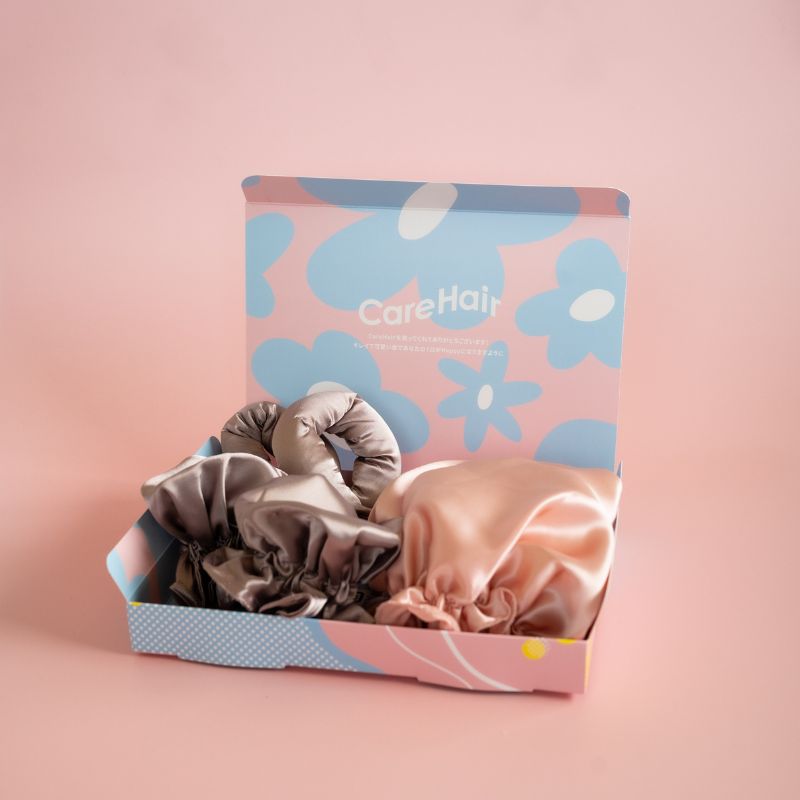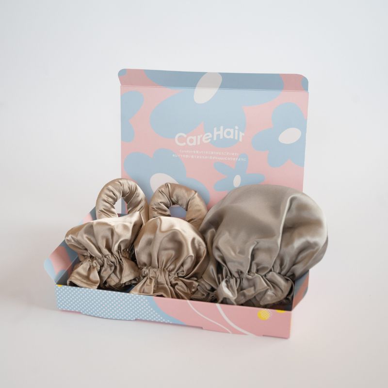 革新的な巻き髪アイテム、ヒートレスカールの「CareHairボンボン」とセットでお使いいただけるシルクのナイトキャップとのセットが誕生!